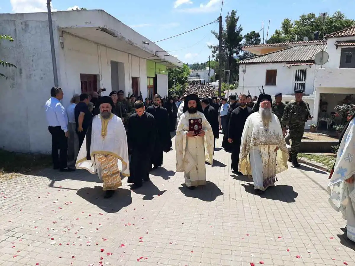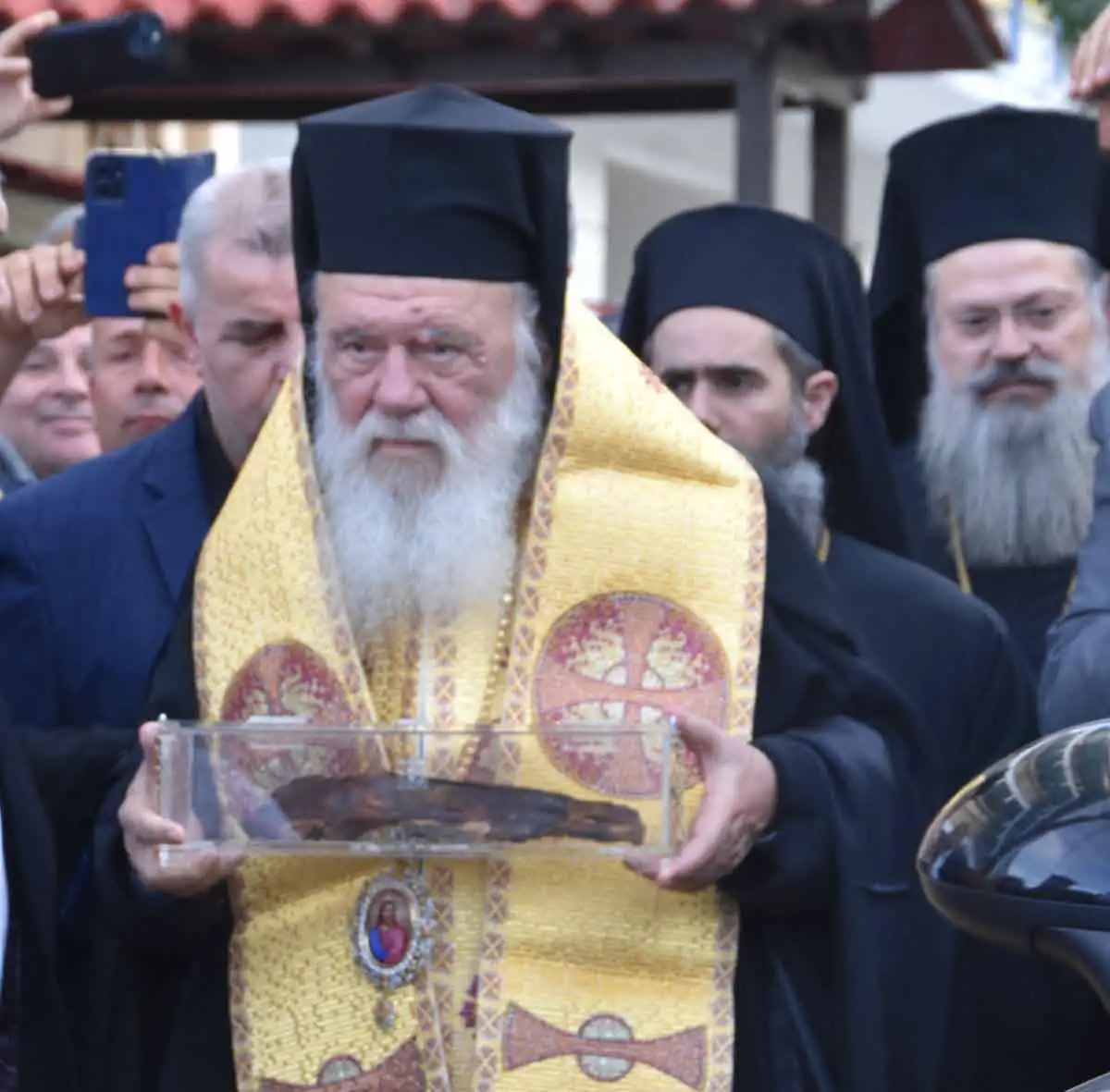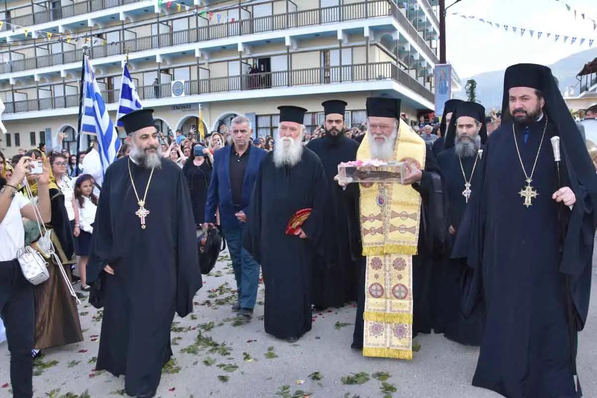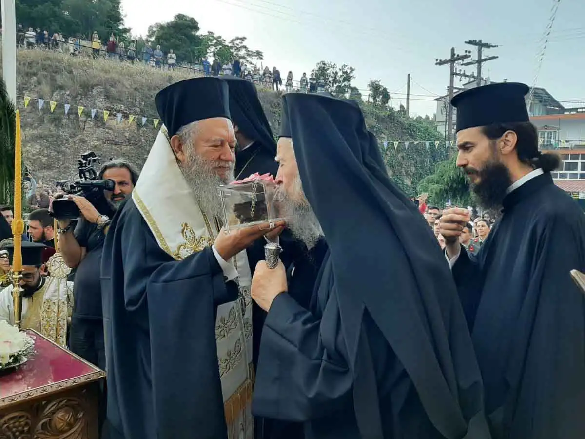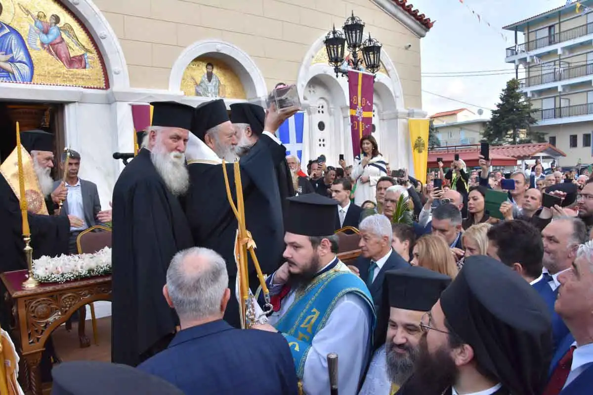 Ρίγη συγκινήσεως προκλήθηκαν κατά την υποδοχή του ιερού αποτμήματος και μετά την απόδοση των τιμών, τελέσθηκε δέηση και ο Σεβασμιώτατος Ποιμενάρχης μας, Μητροπολίτης Χαλκίδος κ. Χρυσόστομος, απευθυνόμενος προς τον Μακαριώτατο Αρχιεπίσκοπο κ. Ιερώνυμο και εξιστορώντας σε όλους τους παρισταμένους την σημασία του σπουδαίου γεγονότος, ανέφερε: «Μακαριώτατε Αρχιεπίσκοπε Αθηνών και πάσης Ελλάδος κύριε ΙΕΡΩΝΥΜΕ,