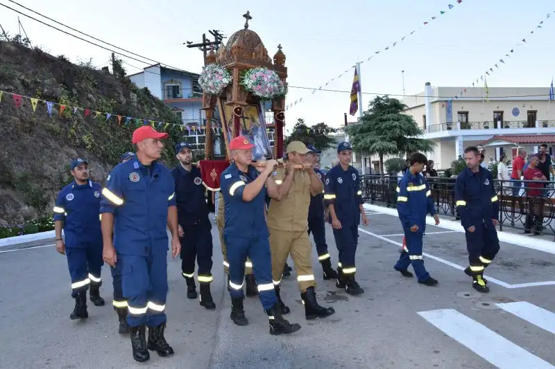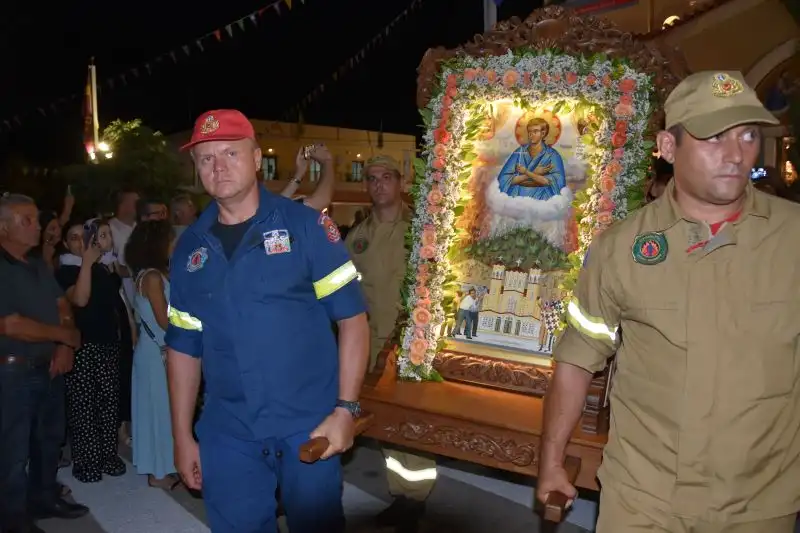 Λίγο πριν τον Εσπερινό, μεταφέρθηκε στον Ι. Ναό του Οσίου Ιωάννου, εν πομπή, η εφέστιος ιερά εικόνα των Αγίων Κωνσταντίνου και Ελένης, προστατών της Ενορίας του Προκοπίου, αφού, υπό την απειλή της πυρκαγιάς συλλειτανεύθηκαν τα ιερά εικονίσματα των Ισαποστόλων βασιλέων και του Οσίου Ιωάννου.