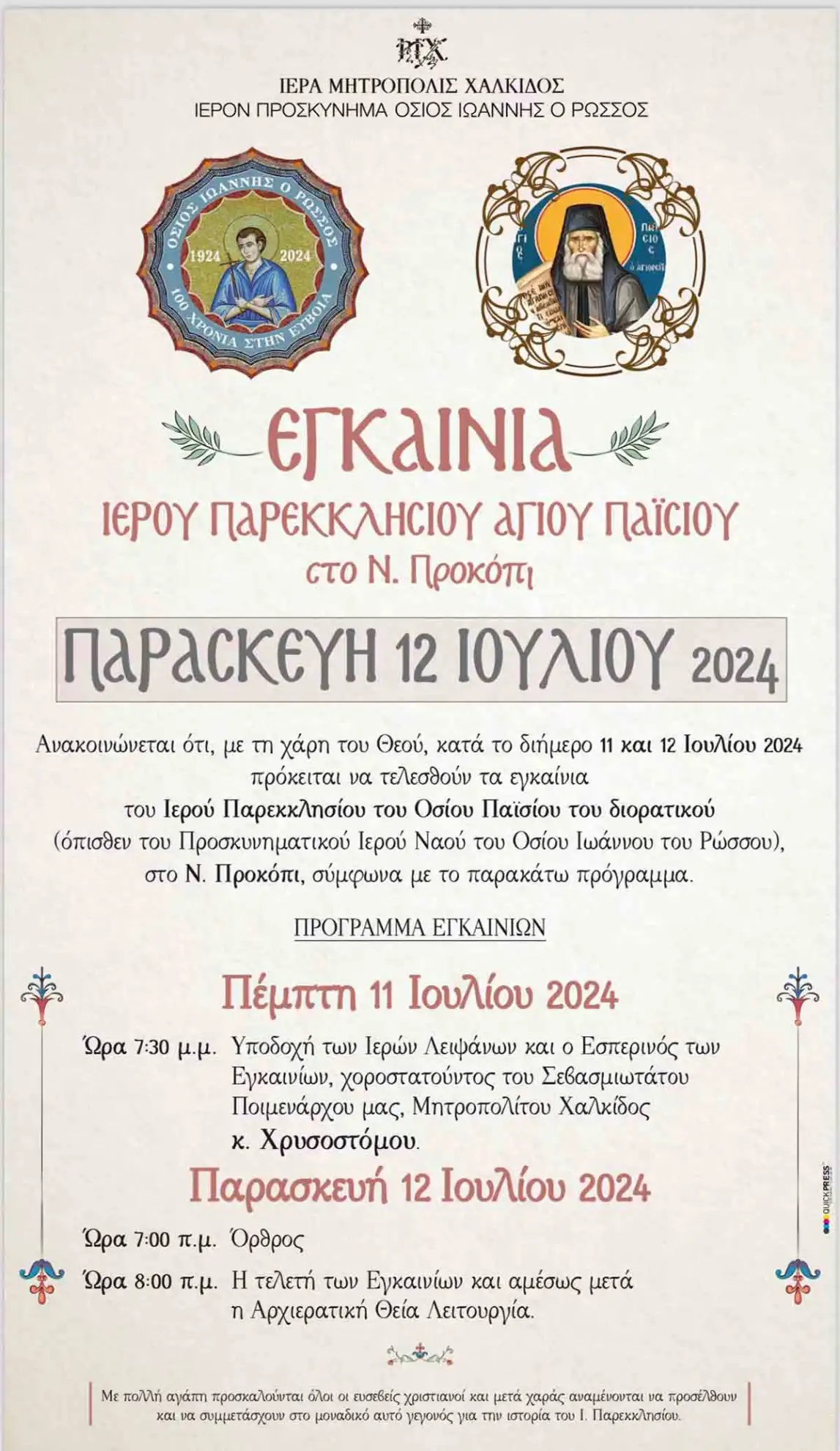 Ανακοινώνεται ότι, με τη χάρη του Θεού, κατά το διήμερο 11 και 12 Ιουλίου 2024 πρόκειται να τελεσθούν τα εγκαίνια του Ιερού Παρεκκλησίου του Οσίου Παϊσίου του διορατικού (όπισθεν του Προσκυνηματικού Ιερού Nαού του Οσίου Ιωάννου του Ρώσσου), στο Ν. Προκόπι, σύμφωνα με το παρακάτω πρόγραμμα.