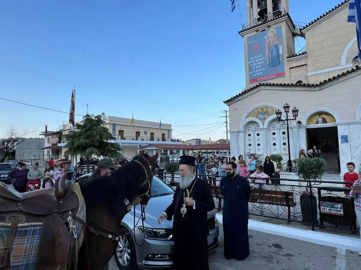 Ο Σεβασμιώτατος Ποιμενάρχης μας, Μητροπολίτης Χαλκίδος κ. Χρυσόστομος, περιοδεύων σήμερα και αύριο στη Β. Εύβοια, πληροφορήθηκε την πρωτοβουλία του Ομίλου και προϋπάντησε τους έφιππους προσκυνητές στο Ιερό Προσκύνημα, ευλόγησε εκείνους και τα άλογά τους και τους συνεχάρη για την ευλαβική τους πορεία.