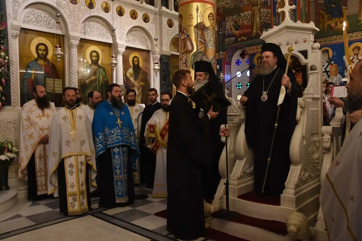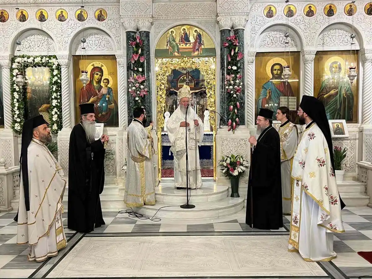 Στον Εσπερινό χοροστάτησε ο Σεβασμιώτατος Μητροπολίτης Ιερισσού κ. Θεόκλητος, συγχοροστατούντων των Σεβασμιωτάτων Μητροπολιτών Πειραιώς κ. Σεραφείμ, Γόρτυνος κ. Νικηφόρου, του Θεοφιλεστάτου Επισκόπου Ωρεών κ. Φιλοθέου-Αρχιγραμματέως της Ι. Συνόδου και του Σεβασμιωτάτου Ποιμενάρχου μας, Μητροπολίτου Χαλκίδος κ. Χρυσοστόμου, με τη συμμετοχή Κληρικών από τη Χαλκίδα και την Β. Εύβοια.