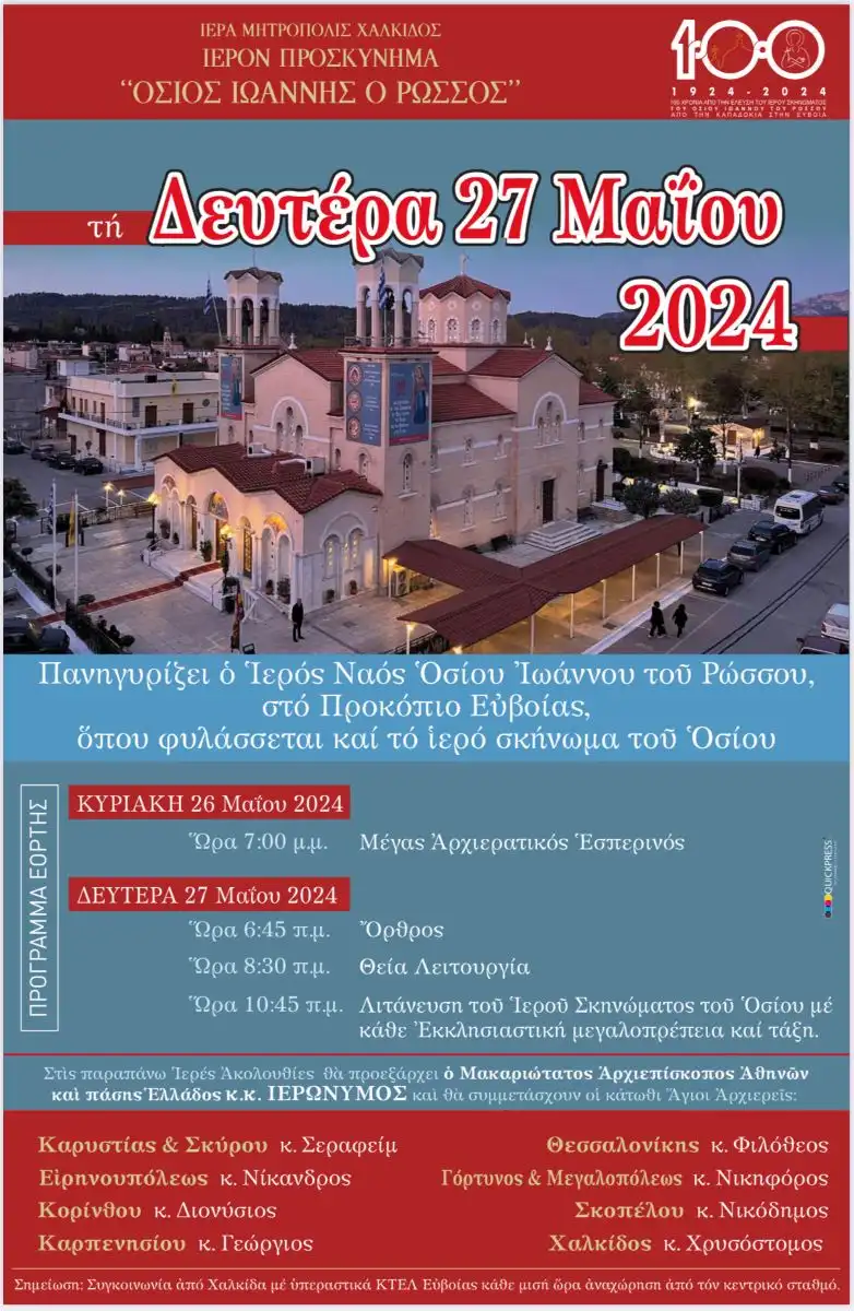 Πρόγραμμα Ιεράς Πανηγύρεως Οσίου Ιωάννου του Ρώσσου - 26 & 27 Μαΐου 2024