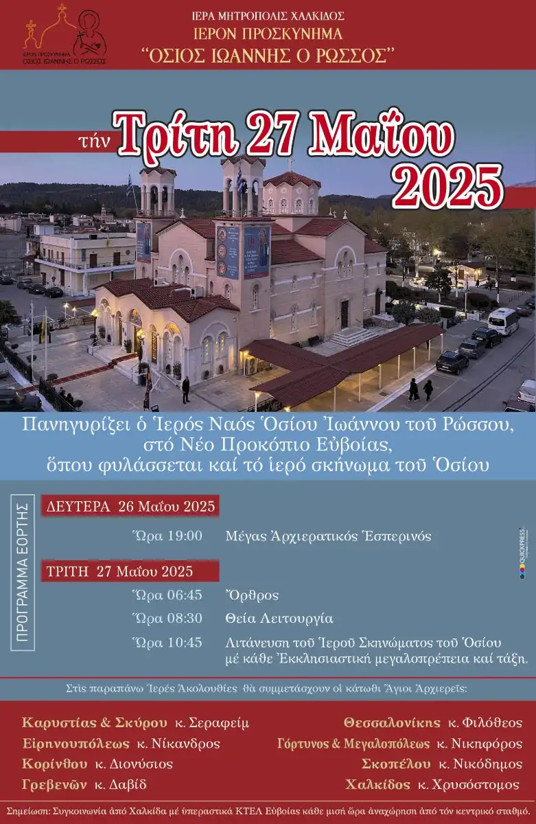 Στην Ιερά Πανήγυρη θα λάβουν μέρος οι Άγιοι Αρχιερείς Καρυστίας και Σκύρου κ. Σεραφείμ, Ειρηνουπόλεως κ. Νίκανδρος, Κορίνθου κ. Διονύσιος, Γρεβενών κ. Δαβίδ, Θεσσαλονίκης κ. Φιλόθεος, Γόρτυνος και Μεγαλοπόλεως κ. Νικηφόρος, Σκοπέλου κ. Νικόδημος και ο οικείος Ιεράρχης, Σεβασμιώτατος Μητροπολίτης Χαλκίδος, Ιστιαίας και Βορείων Σποράδων κ. Χρυσόστομος.